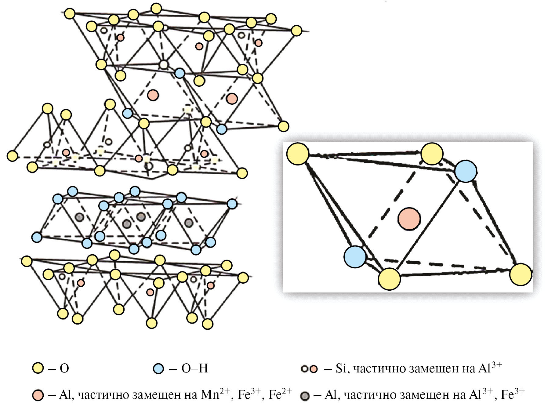 где значение x для железистого хлорита колеблется от 1.6 до 2. Если двухвалентные катионы Mg2+ замещаются двухвалентными катионами Fe2+ по схеме “атом за атомом”, то образуется структура так называемого клинохлора. Его октаэдрические (O) листы, в отличие от тетраэдрических (T), могут быть заполнены небольшими количествами двухвалентных катионов Mn2+ и Zn2+. Такие структурные преобразования искажают решетку с уменьшением размера алюминиево-кислородных октаэдров (рис. 1) [5].