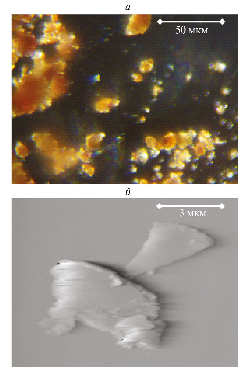 Рис. 2. Рассеяние частиц и их микроагрегатов (оптическая микроскопия, на отражение) в полиминеральной глине (а), отдельная частица с различимыми слоями (АСМ-сканирование) (б).
