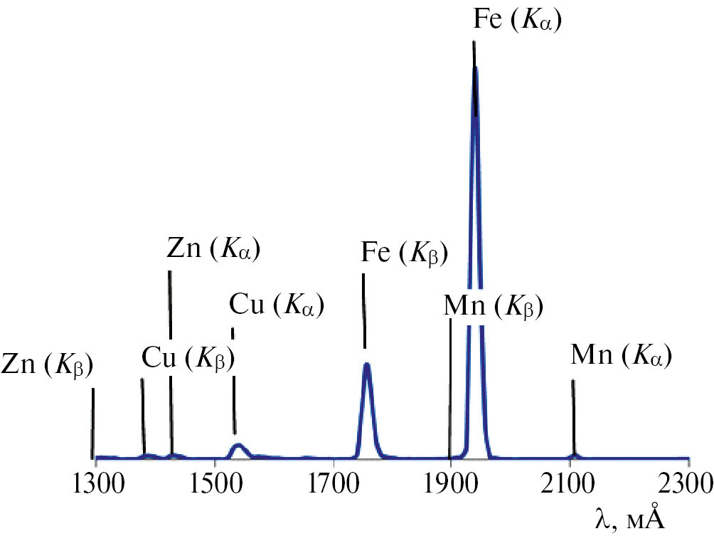 Спектры рентгеновской флуоресценции глины показаны на рис. 3. Наиболее интенсивные линии серии K были связаны с железом. Интенсивности Kα- и Kβ-линий цинка (Zn), меди (Cu) и марганца (Mn) сопоставимы с фоном.