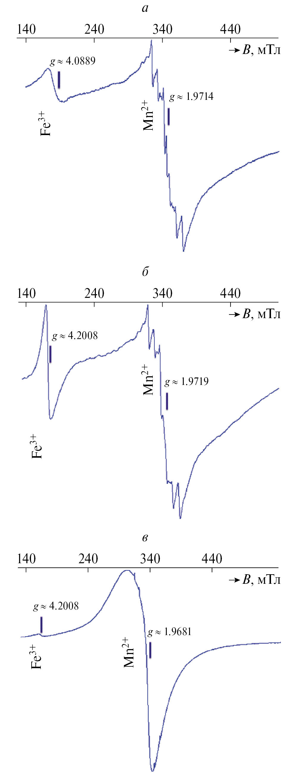 Рис. 5. Обзорные спектры ЭПР образца глины в исходном состоянии (а), после обжига при температурах 620 (б) и 900°С (в): представлены значения g-фактора парамагнитных центров железа и марганца.