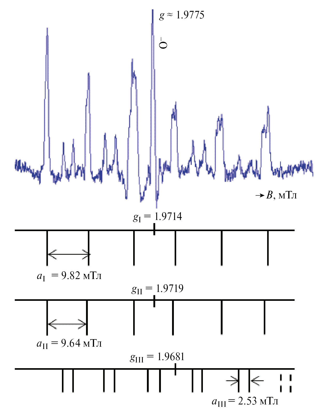 Спектр ВП ЭПР исходной полиминеральной глины в узкой области g ≈ 2.00 показан на рис. 6. Этот спектр может быть объяснен присутствием ионов Mn2+ в разных неэквивалентных положениях I, II и III внутри октаэдрических кристаллических пластин клинохлора и монтмориллонита (филлосиликатный октаэдрический лист). Эти ионы характеризуются различными g-факторами и константами сверхтонких взаимодействий (СТВ) aI, aII и aIII с ядрами 55Mn (табл. 1). Ионы Mn(I) и Mn(II) дают частично перекрывающиеся секстетные спектры. Схема сверхтонких расщеплений показана на рис. 6. Положения крайних левых линий секстетов Mn(I) и Mn(II) совпадают, что дает максимальную интенсивность этой линии, остальные линии только частично перекрываются, поэтому их наблюдаемые суммарные интенсивности уменьшаются. Сверхтонкие взаимодействия с ядерным спином этих ионов характеризуются константами aI = 9.97 мТл для ионов Mn2+ в положении I и aII = 9.76 мТл для ионов Mn2+ в положении II.