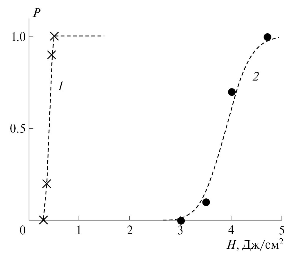 Рис. 3. Зависимость вероятности появления (Р) обнаруженных типов свечения для угля марки ДГ от плотности энергии лазерных импульсов: 1 – первый тип свечения, Hcr(1) = (0.40 ± 0.05) Дж/см2 (рис. 2а); 2 – второй тип свечения, Hcr(2) = (3.9 ± 0.4) Дж/см2 (рис. 2б).