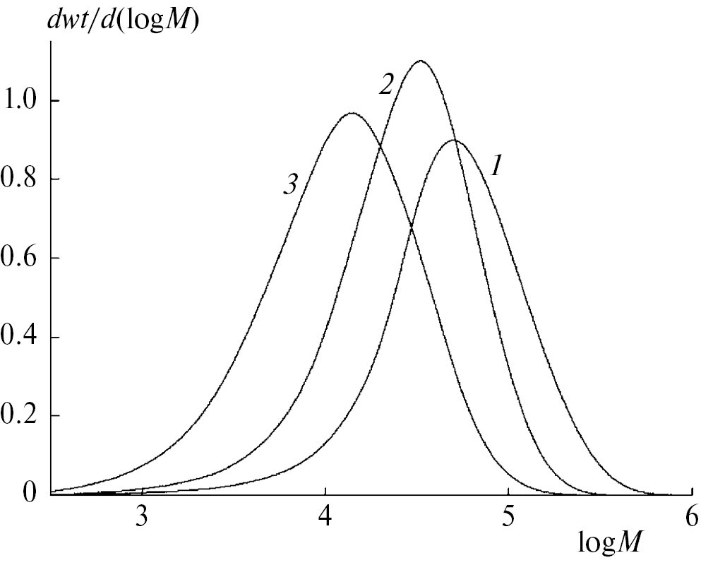 Рис. 4. Кривые ММР ПЛА в зависимости от времени УФ-облучения: 1 – 0 ч, 2 – 3 ч, 3 – 24 ч.