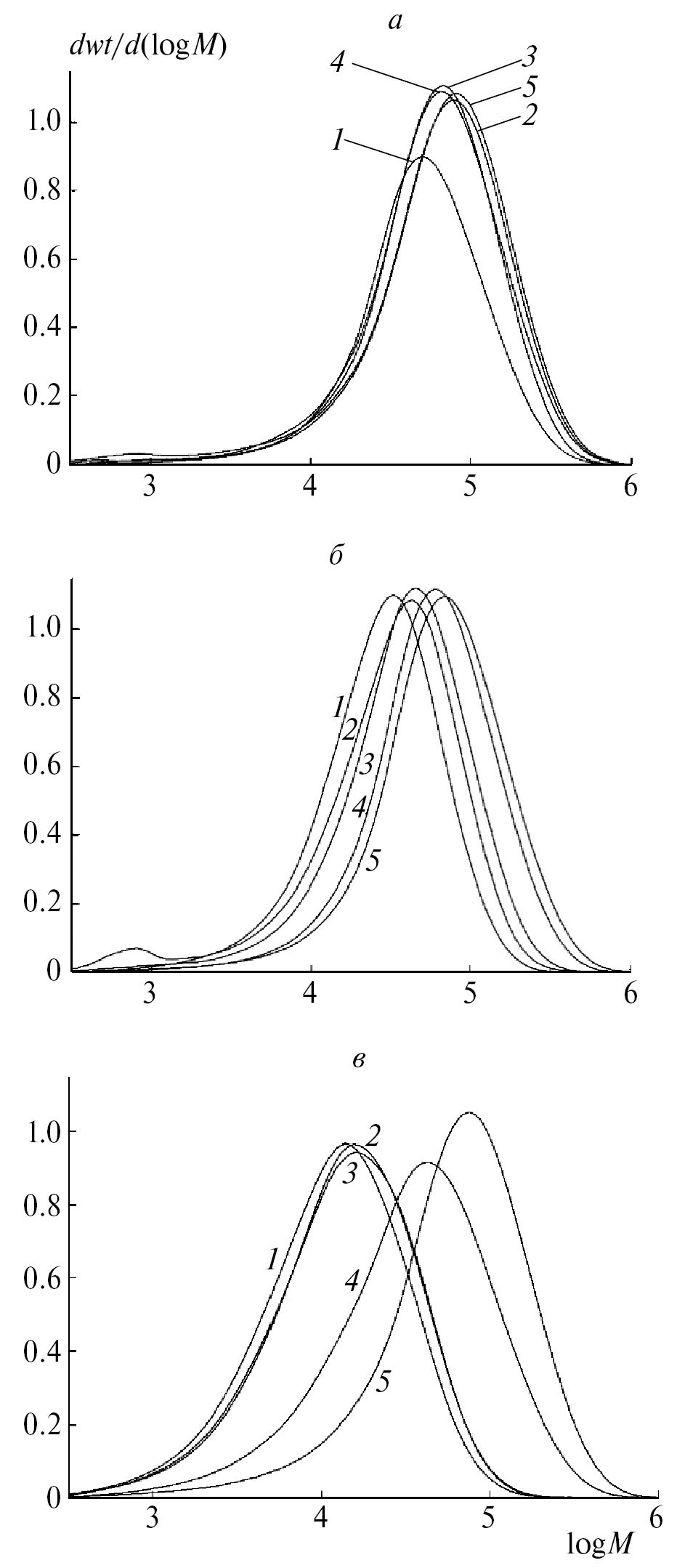 Рис. 5. а – Кривые ММР композиций на основе ПЛА (1), содержащих 0.1 (2), 0.25 (3), 1 (4) и 5 мас. % (5) НПГ без воздействия УФ-облучения; б – кривые ММР композиций на основе ПЛА (1), содержащих 0.1 (2), 0.25 (3), 1 (4) и 5 мас. % (5) НПГ при УФ-облучении в течение 3 ч; в – кривые ММР композиций на основе ПЛА (1), содержащих 0.1 (2), 0.25 (3), 1 (4) и 5 мас. % (5) НПГ при УФ-облучении в течение 24 ч.