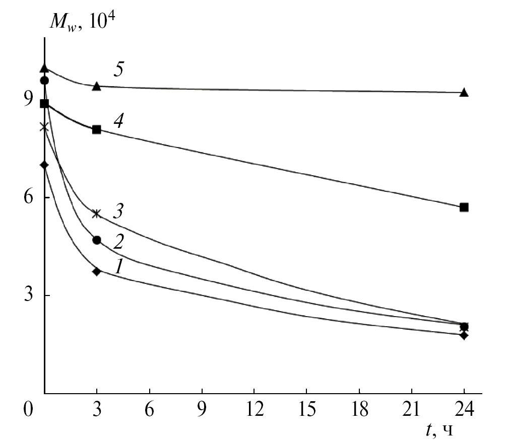 Рис. 6. Влияние времени УФ-облучения на Мw исходного ПЛА (1) и ПЛА в композициях с НПГ различного состава. Содержание НПГ: 0.1 (2), 0.25 (3), 1 (4), 5 мас. % (5).