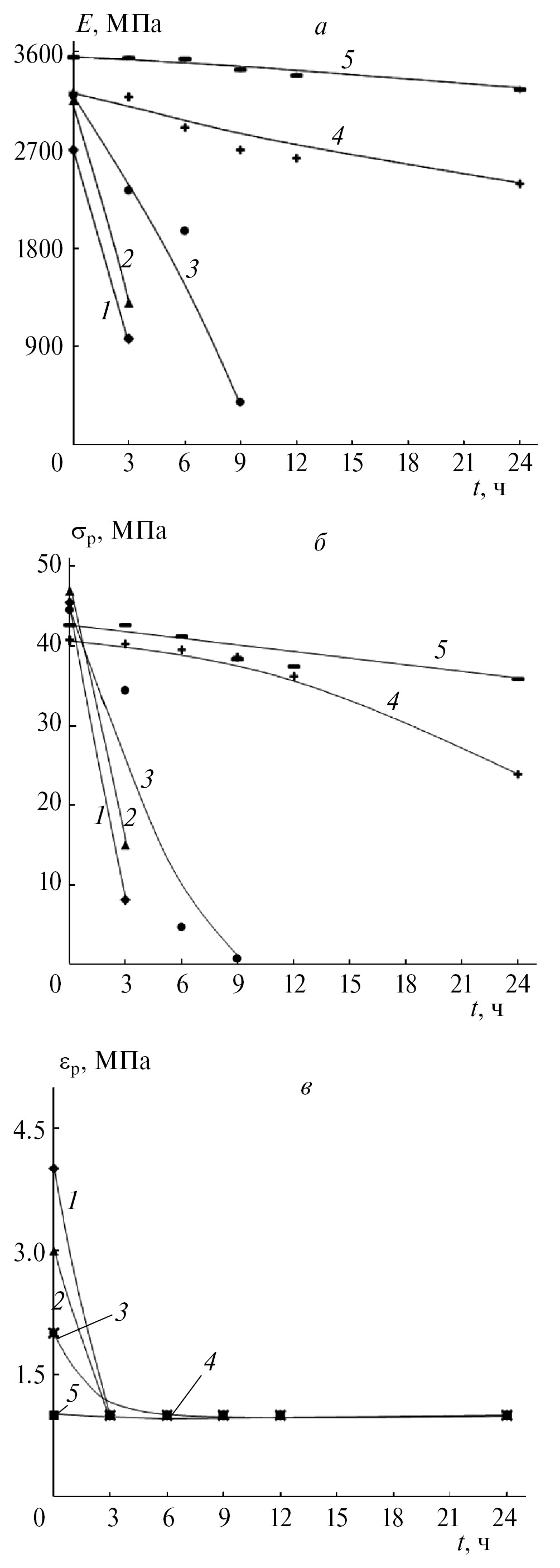 Рис. 7. а – Зависимость модуля упругости Е композиций исходного ПЛА (1) и композиций ПЛА–НПГ с содержанием НПГ 0.1 (2), 0.25 (3), 1 (4) и 5 мас. % (5) от времени УФ-облучения; б – зависимость предельной прочности σр композиций исходного ПЛА (1) и композиций ПЛА–НПГ с содержанием НПГ 0.1 (2), 0.25 (3), 1 (4), 5 мас. % (5) от времени УФ-облучения; в – зависимость удлинения при разрыве εр композиций исходного ПЛА (1) и композиций ПЛА–НПГ с содержанием НПГ 0.1 (2), 0.25 (3), 1 (4), 5 мас. % (5) от времени УФ-облучения.