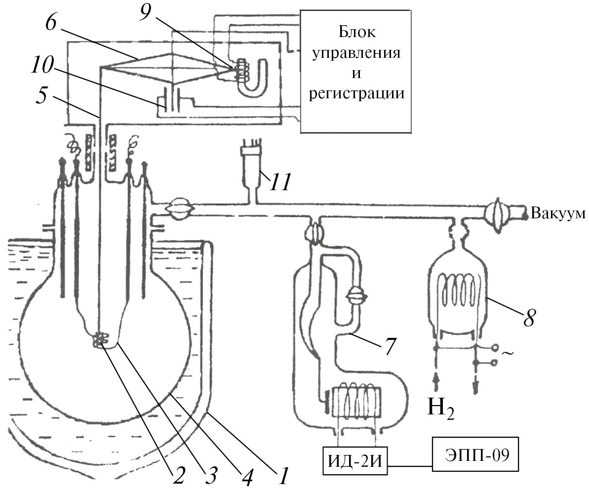 Навеска металла 2 (рис. 1) подвешивалась на кварцевой нити 5 внутри атомизатора водорода 3, который, в свою очередь, располагался в центре колбы. Другой конец нити крепился непосредственно к коромыслу электронных весов 6, способных измерять скорость испарения навески металла с точностью до 0.5 мг/с. Давление H2 регистрировалось мембранным манометром 7. На рис. 1: 8 – никелевый натекатель водорода; 9 – катушка электромагнитного компенсатора веса; 10 – дифференциальная емкость, регистрирующая поворот коромысла весов; 11 – термомонометрическая лампа. Атомизатором служили два витка вольфрамовой проволоки диамертом 0.1 мм, способные разогреваться до 2500 К. Известно [3, 4], что молекулы Н2 каталитически распадаются на атомы Н при столкновении молекул Н2 с разогретой до высокой температуры поверхностью вольфрама. Количество атомов H, производимое в секунду при столкновении молекул Н2 с поверхностью вольфрама можно грубо оценить, используя формулу [4]:
