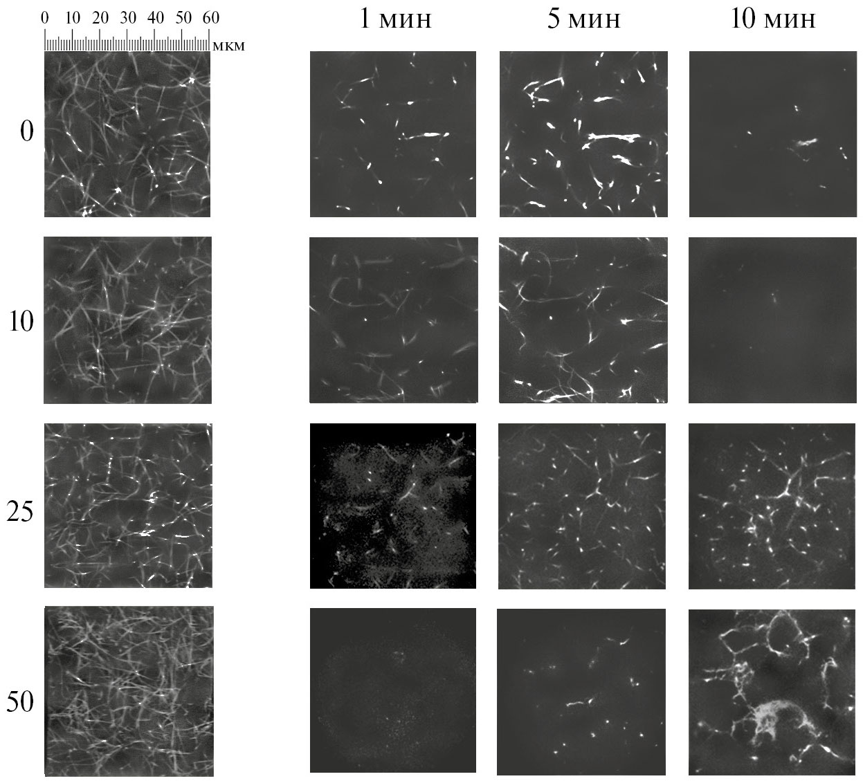 Для исследования методом КЛСМ кинетики гидролиза фибринового геля и распределения в нем плазмина гель получали из немеченого ФГ. На первом этапе ФИТЦ-меченный плазмин(оген) связывается с волокнами фибрина, визуализируя структуру сети. С течением времени происходит гидролиз геля (рис. 3, столбцы 2–4). Нативный ФГ и обработанный 10 мкМ HOCl демонстрируют схожую динамику: визуализация фибриновой сети начинается уже с конца первой минуты, к 5-й минуте сеть визуализирована полностью, а к 10-й минуте наблюдается почти полный ее гидролиз. Для ФГ, обработанного 25 и 50 мкМ окислителя, процессы визуализации геля и его гидролиза в существенной мере замедлены.