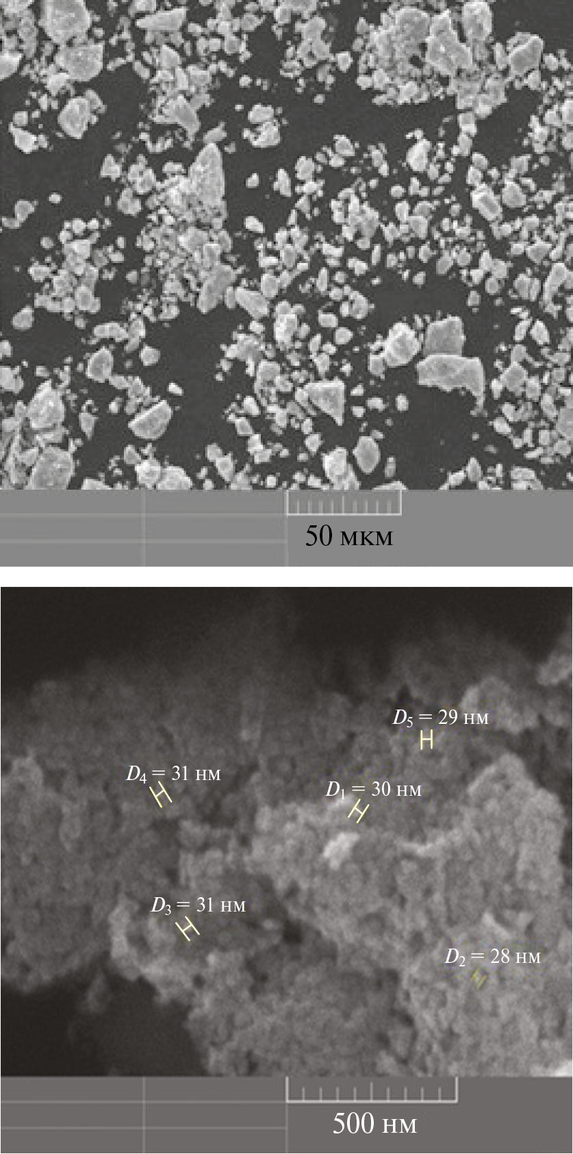 Исследование образцов методом сканирующей электронной микроскопии показало, что порошок наночастиц Ni представляет собой агрегаты, состоящие из плотно агрегированных частиц сферической формы. На рис. 1 представлены микрофотографии образца наночастиц Ni, средний размер которых составляет 29 нм.