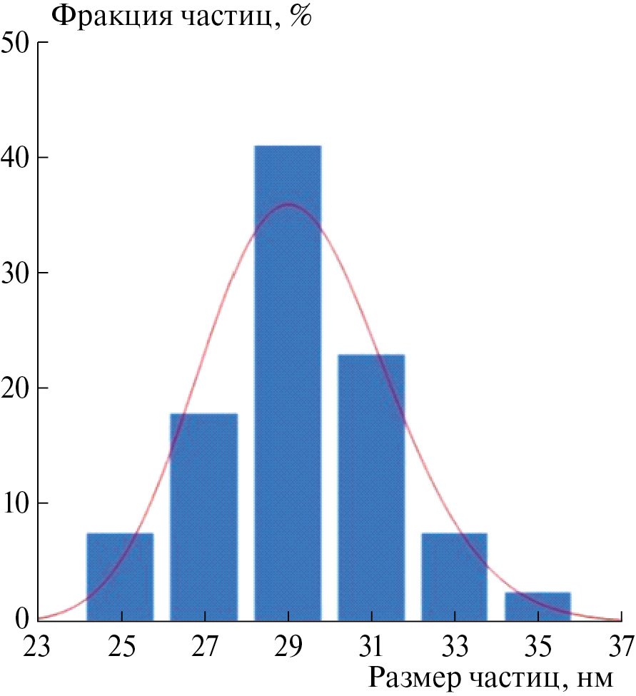 На основании микрофотографий проведен расчет распределения наночастиц Ni по размерам. Как это видно из приведенных данных на рис. 2, гистограмма характеризуется нормальным логарифмическим распределением частиц, преобладают наночастицы никеля размером 27–31 нм.