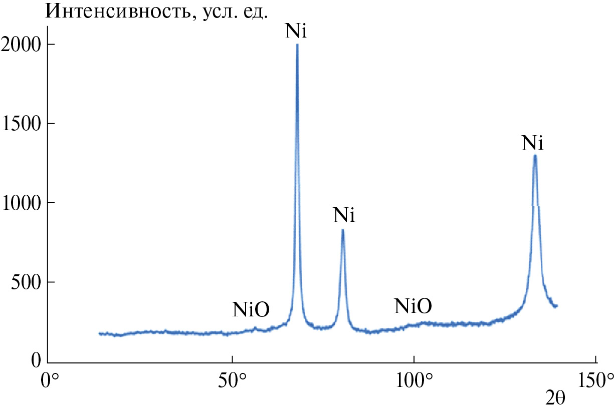 Качественный рентгенофазовый анализ образца проводили на дифрактометре “Дифрей-401” (Россия), съемка осуществлялась по схеме Брегга–Брентано. Исследование поверхностей образцов осуществляли с помощью сканирующего электронного микроскопа (СЭМ) Tescan Vega 3 SB производства компании Tescan Brno (Czech Republic). С помощью дифференциального сканирующего калориметрического и термогравиметрического анализов (ДСК/ТГА) на совмещенном анализаторе TM SDT Q600 производства компании TA Instruments (USA) был установлен характер довосстановления порошка наночастиц никеля.