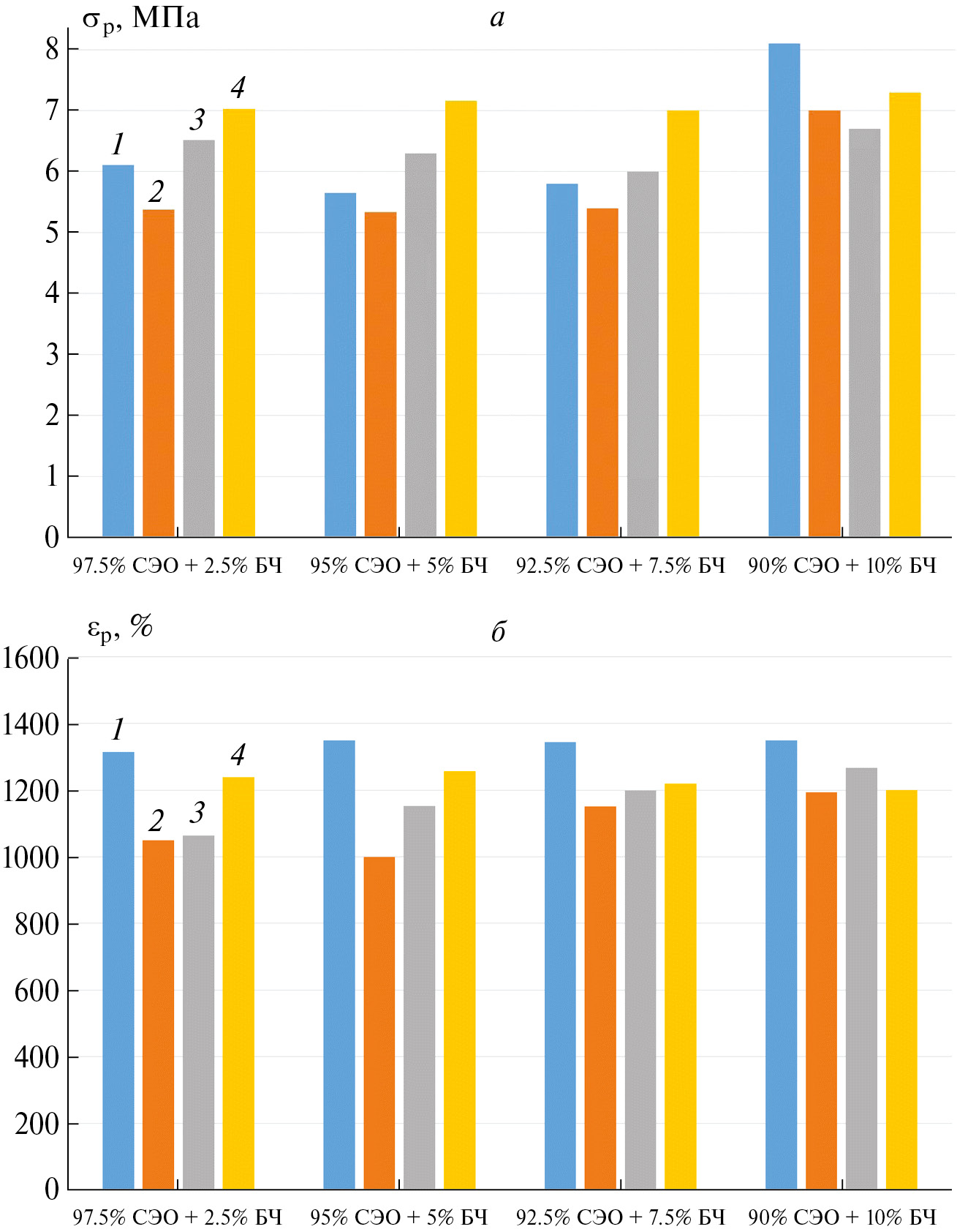 Рис. 6. Номограммы, полученные из экспериментальных данных: максимальная прочность (а) и относительное удлинение (б) композитов на основе СЭО, наполненных базальтовой чешуей со следующими размерами: 0–50 мкм (1), 50–100 мкм (2), 100–160 мкм (3), 0–300 мкм (4).