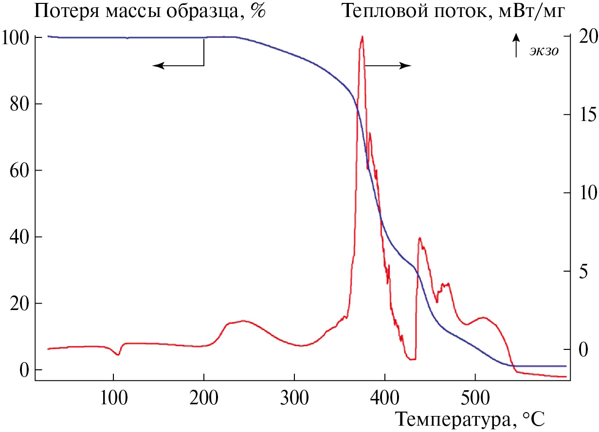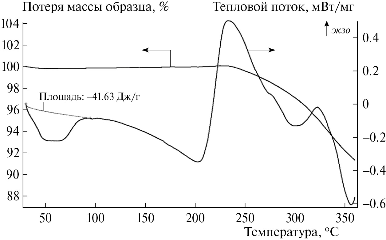 Рис. 7. Синхронный ТГ/ДСК-анализ СЭО в диапазоне температур 20–350 °С.