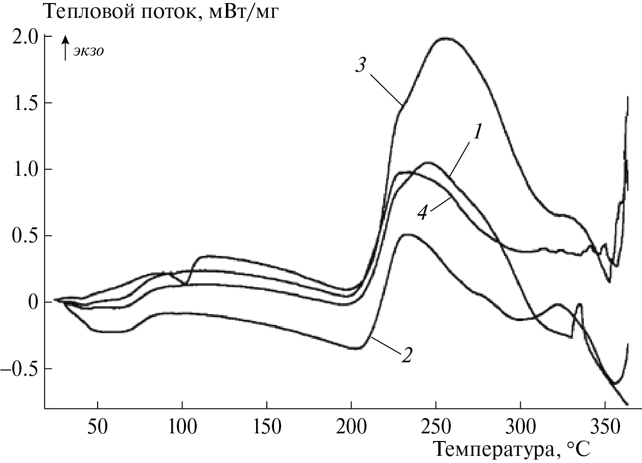 Рис. 10. Кривые ДСК для тех же составов композитов, что и в случае рис. 9.