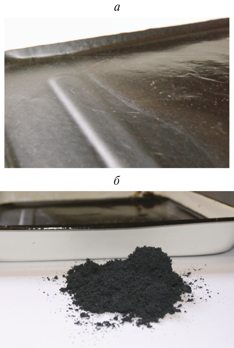 Рис. 1. Образцы графитовых материалов на основе коллоидно-графитовой суспензии из ТРГ: а – графитовая пленка высушенная из надосадочной суспензии в результате отмывки водой и центрифугирования (пленка из КГ/ТРГ); б – терморасширенный графит, полученный в результате термической обработки пленки при Т = 350°С (возвращение к ТРГ).