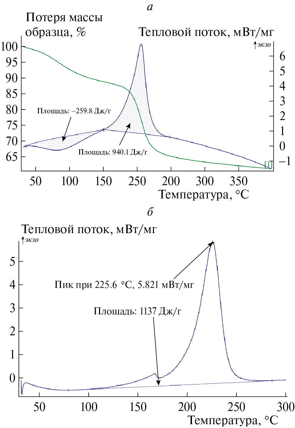 Рис. 2. Экзотермические эффекты при термостимулированном нагреве сильно окисленных ТО-3 и ТРГ: а – зависимости ДСК для ТО-3; б – зависимости ДСК для ТРГ.