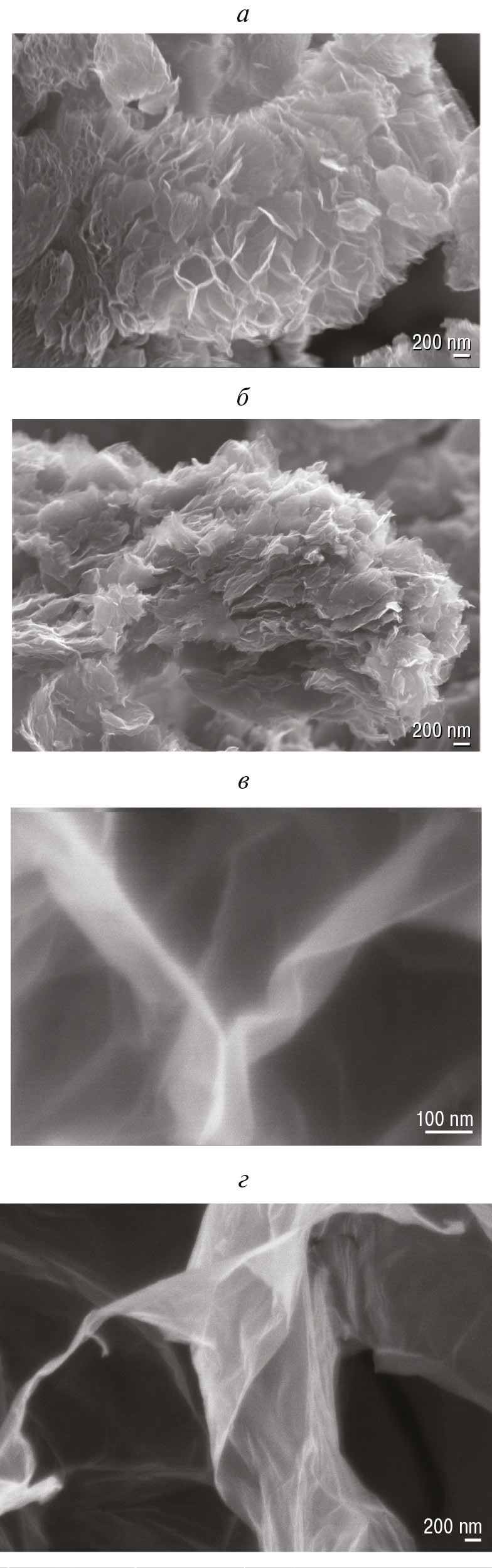 Рис. 3. Сравнение микрофотографий терморасширенных графитов после термостимулированных нагревов: после слабого (а) и сильного (б) окисления; в, г – отдельные участки расщепленных под действием микроволнового излучения (в СВЧ-печи) графитовых частиц до графеновых фрагментов.
