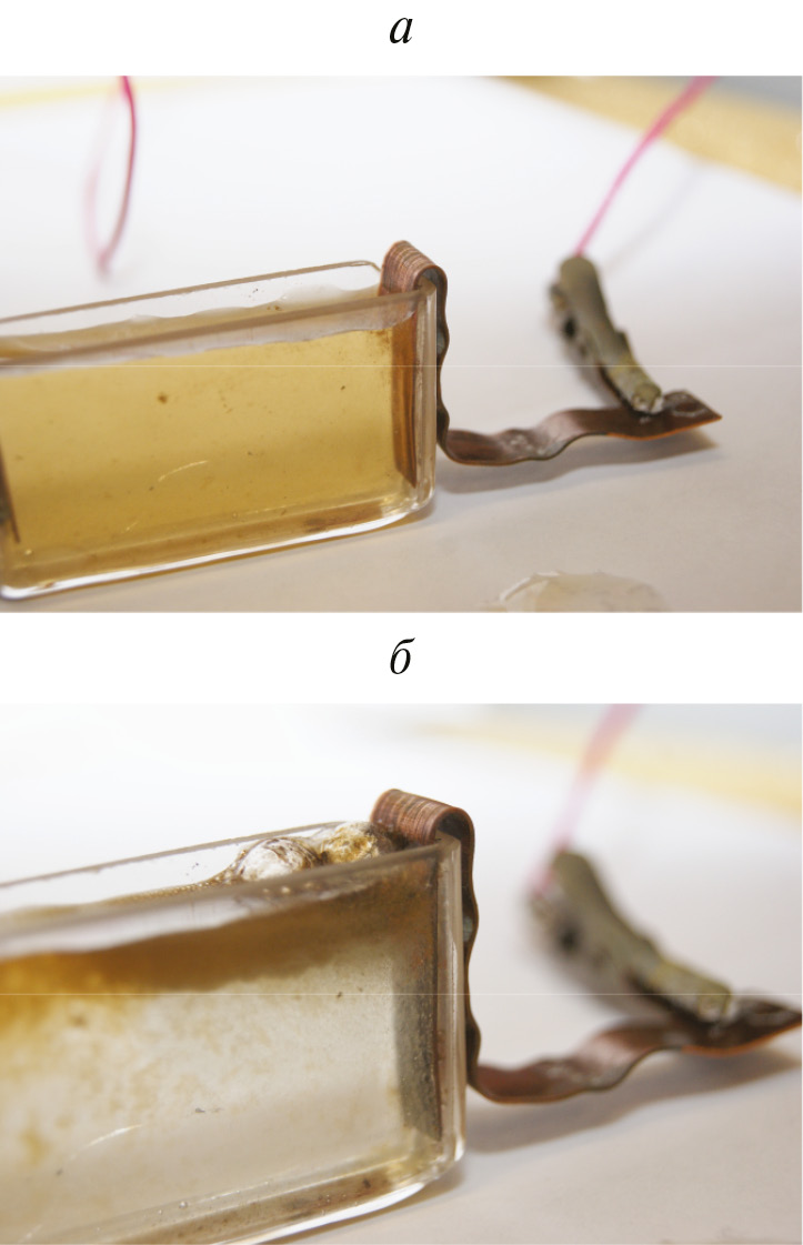 При напряжении 100 В и токе 140 мА в кварцевой кювете происходило перемещение частиц ОГ/ТРГ после сильного окисления (рис. 4). Графитовая суспензия (рН 2.0) была приготовлена из расчета 3 г пасты сильно окисленного графита на 300 г воды. Частицы графитовой суспензии под действием электрического поля перемещались в сторону медного электрода с отрицательным потенциалом, на котором наблюдались газовыделение и образование осадков черного цвета. С течением времени частицы осадка всплывают (рис. 4б). Собранные частицы графита были диспергированы в воде под действием ультразвука. Образовалась прозрачная суспензия коричневатого цвета, которая по сравнению с исходной суспензией ОГ/ТРГ оказалась неустойчивой, и для повышения устойчивости необходимо вводить ПАВ.
