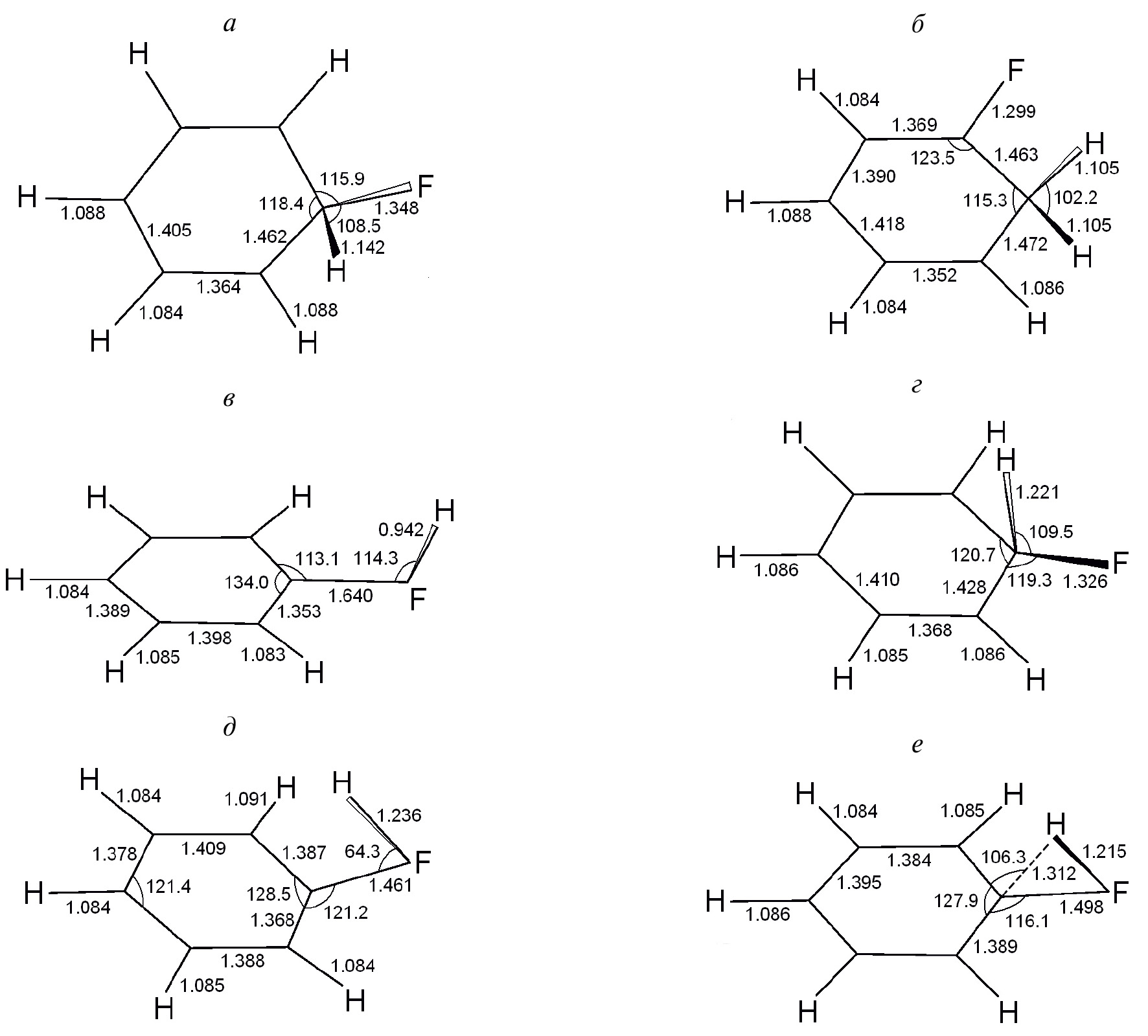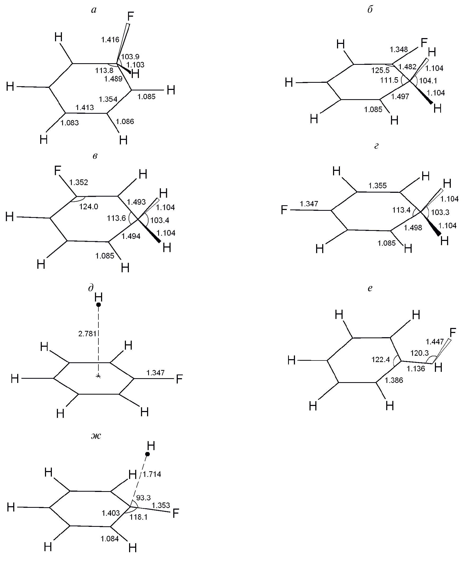 Рис. 1. Структурные модели ипсо- (а), орто- (б), мета- (в), пара- (г) фторциклогексадиенил-радикалов, комплекса C₆H₅F · H (д) и переходных комплексов TS₁ (е) и TS₂(ж). Межъядерные расстояния приведены в ангстремах, углы – в градусах.