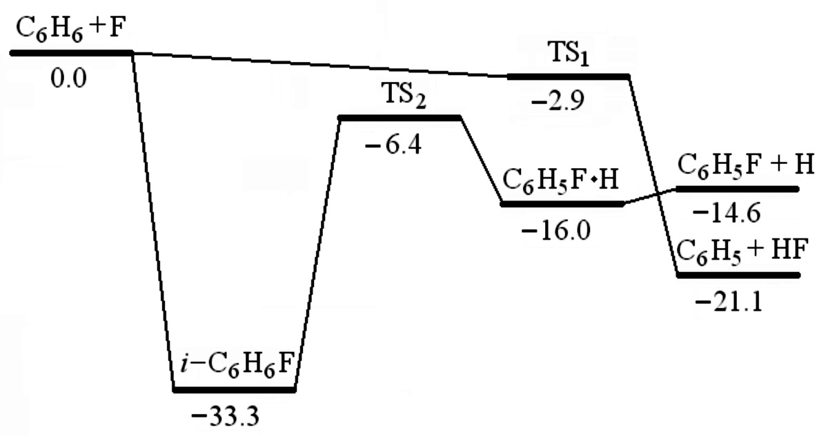 C₆H₆ + F → C₆H₆F → TS₂ → C₆H₅F + H. (7)