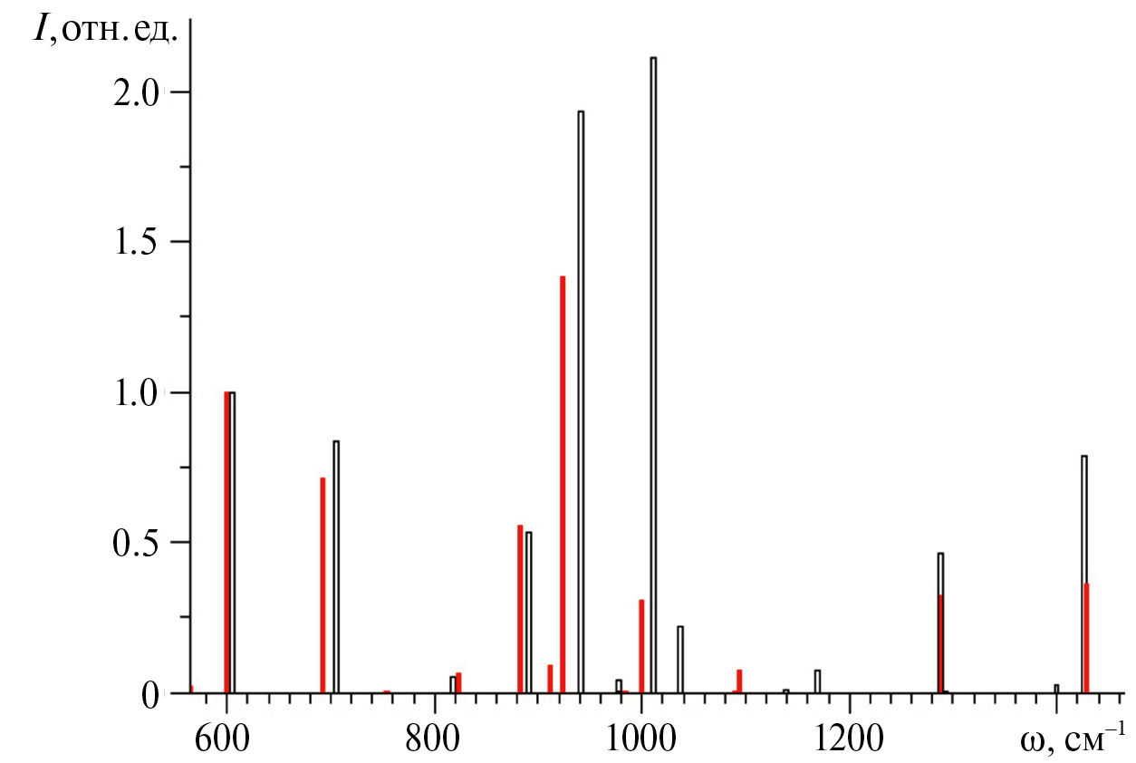Полосы поглощения при 1000 и 1094 см⁻¹ многократно различаются по интенсивностям, а полоса при 912 см⁻¹ не совпадает ни с одной из рассчитанных частот фундаментальных колебаний (см. табл. 4). Сравнение с частотами фундаментальных колебаний других изомеров совпадения с экспериментальными полосами не дает, т.е. в эксперименте [10] изомеризация не обнаруживается.