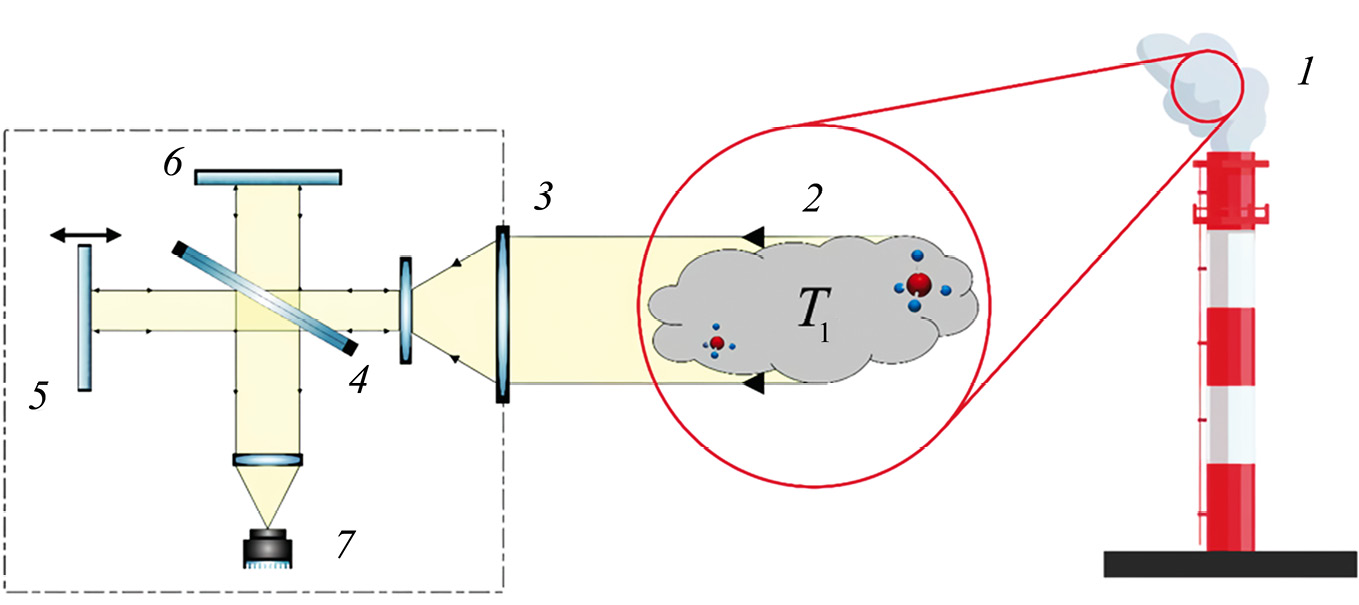 Рис. 1. Принципиальная схема регистрации спектров отходящих газов ДТ с температурой T₁ с помощью ИК-фурье-спектрометра: 1 – отходящие газы дымовых труб, 2 – входящее излучение, 3 – собирающий объектив, 4 – светоделитель, 5 – подвижное зеркало интерферометра, 6 – неподвижное зеркало интерферометра, 7 – КРТ-фотоприемник.