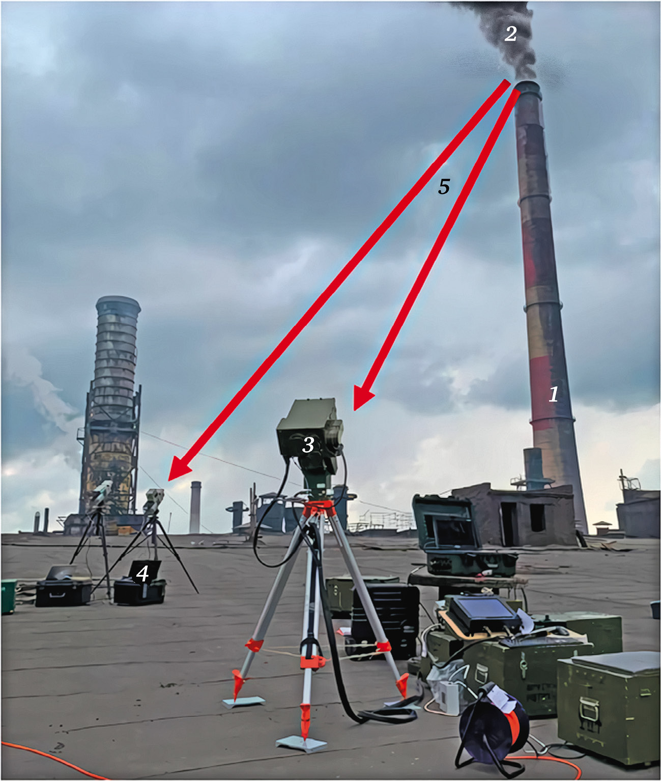 На рис. 2 приведена схема эксперимента по дистанционной регистрации ИК-спектров отходящих газов ДТ на Надеждинском металлургическом заводе им. Б.И. Колесникова. Цифрами 3 и 4 обозначены ИК-фурье-спектрометры, имеющие угловые поля зрения 2.0° (ФСР-1) и 0.7° (ФСР-2) соответственно. Основные технические параметры ФСР-1 и ФСР-2 приведены в табл. 1.