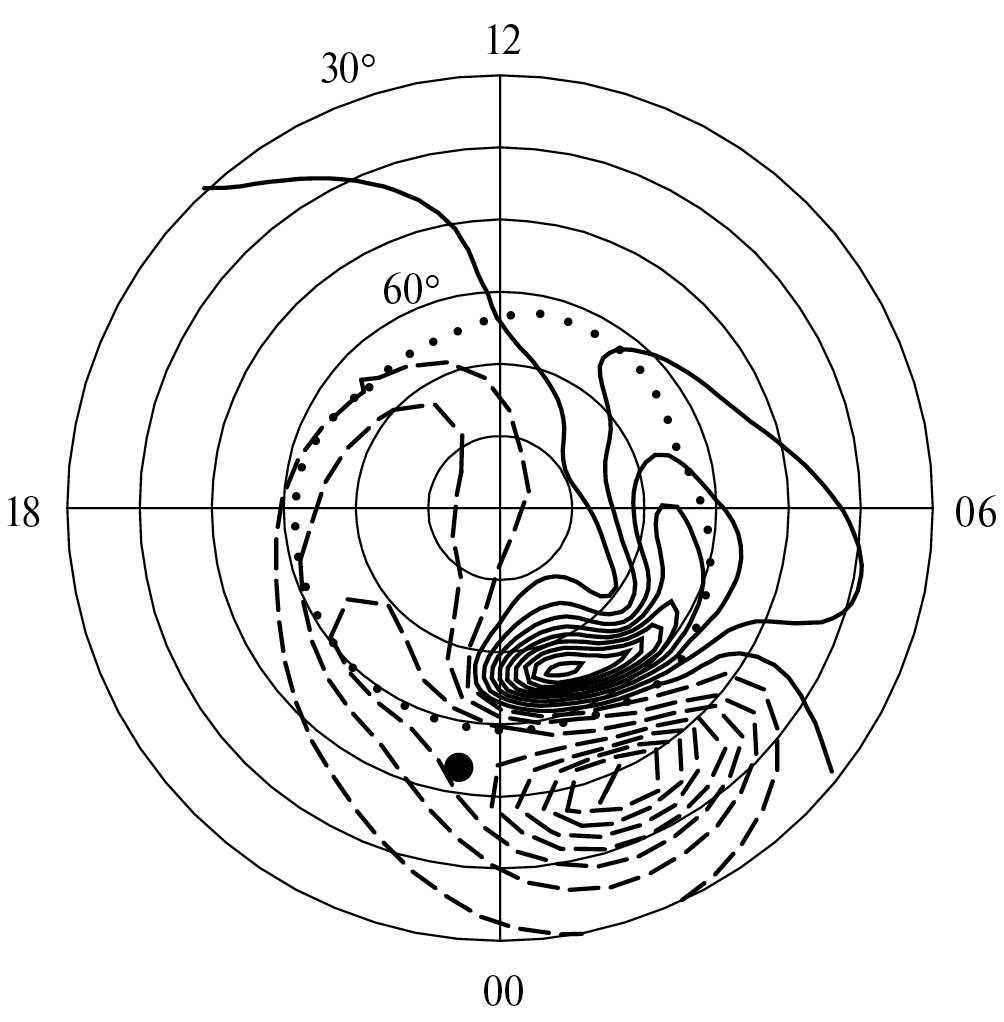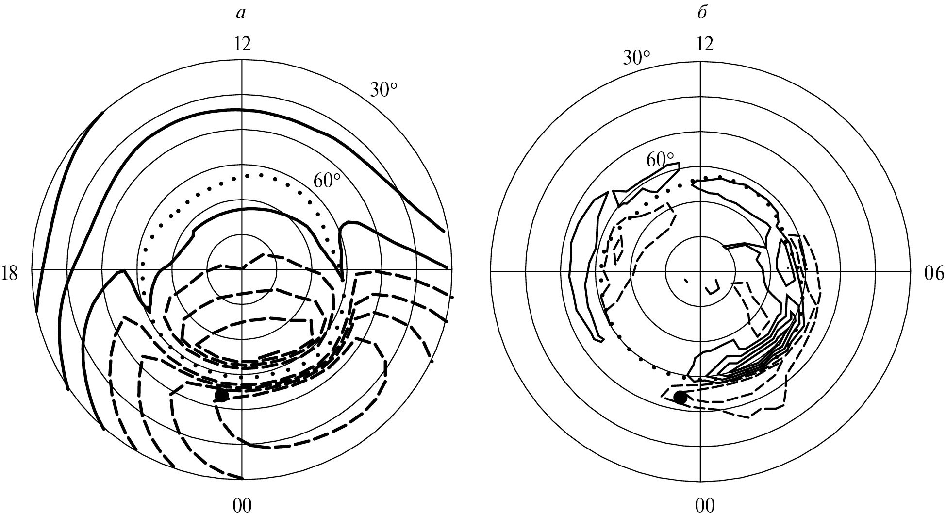 Существенное усложнение задачи по сравнению с моделями из работ [21, 26] связано с отличием областей полярных шапок от остальной части ионосферы. В последней каждая магнитная силовая линия начинается в южном полушарии и заканчивается в северном. Тем самым за счет высокой продольной проводимости обеспечивается идеальная электрическая связь между северной и южной частями ионосферы. Поэтому уравнения (1) для этих частей суммируются. А из полярных шапок магнитные силовые линии уходят далеко в хвост магнитосферы и остаются независимыми. Это разделение мы приближенно моделируем наличием границы между областями замкнутых и разомкнутых силовых линий. В соответствии с работой [27] мы проводим эти границы на основании распределений продольных токов, как границы между зонами 1 и 2. Пример такой границы показан на рис. 2 точечной кривой. Положения этой границы северной полярной шапки несколько различны на двух фрагментах рис. 2. Ее точки находятся на тех же силовых линиях, но на разных высотах: проводимости отнесены к высоте максимальной ионосферной проводимости – 120 км, а продольные токи измерены над ионосферой на высоте 780 км.