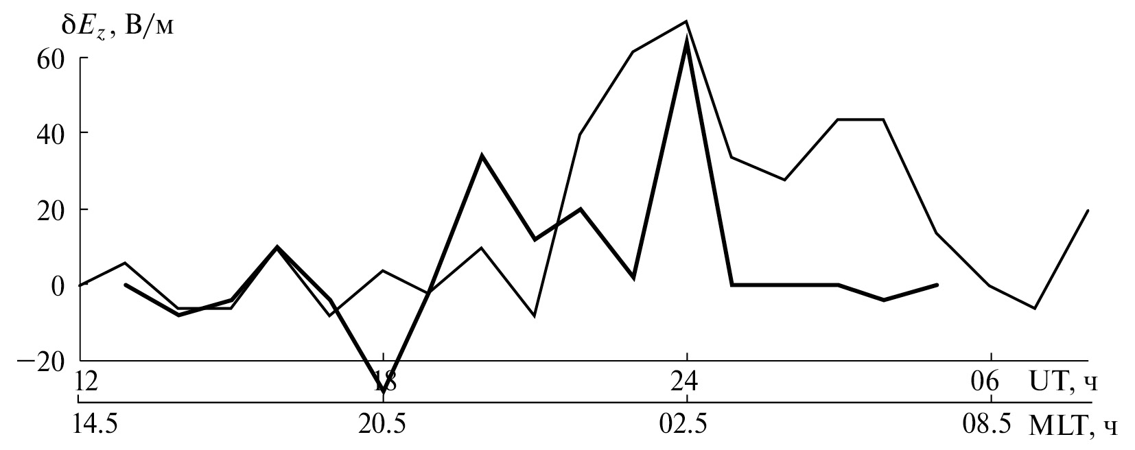 Рис. 4. Временной ход вариации напряженности приземного электрического поля dEz, измеренной в обсерватории “Борок” [13], с положительным сдвигом на 68 В/м (тонкая линия). Модельный вклад магнитной бури показан жирной линией; MLT – местное магнитное время в поселке “Борок”.