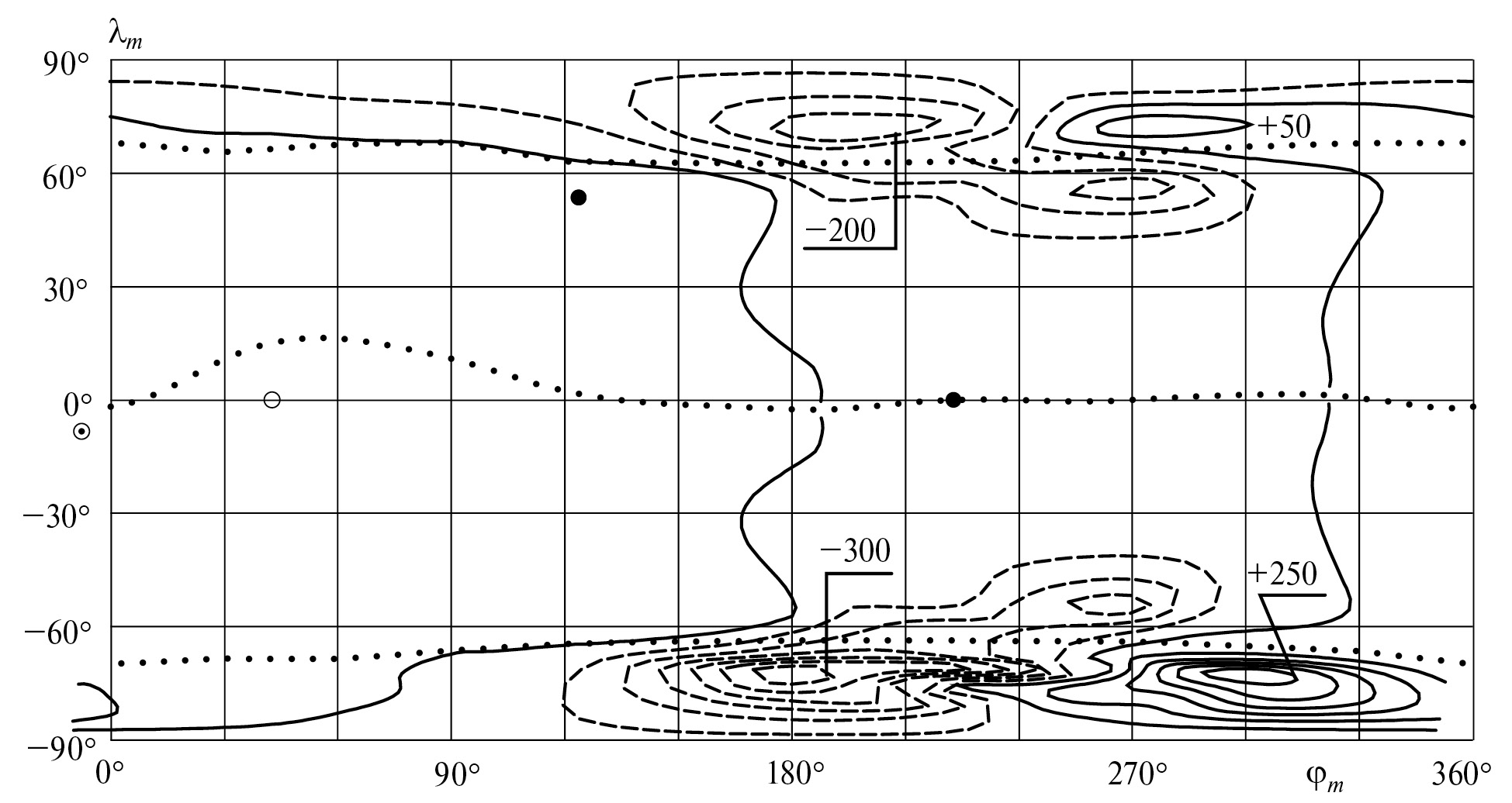 Рис. 5. Глобальное пространственное распределение ионосферного потенциала в геомагнитных координатах (долгота–широта), полученное в модельных расчетах для момента времени 14 UT. Изолинии потенциала построены с шагом 50 кВ. Штриховыми линиями показаны изолинии с отрицательными значениями потенциала. В северной полярной шапке потенциал изменяется от –244 до +72 кВ, в южной – от –340 до +280 кВ. Кружками на геомагнитной широте 0º показаны местный полдень (светлый кружок) и местная полночь (темный кружок). Также кружком в северном полушарии отмечено положение обсерватории “Борок”. Точечными линиями показаны геомагнитный экватор и границы полярных шапок.