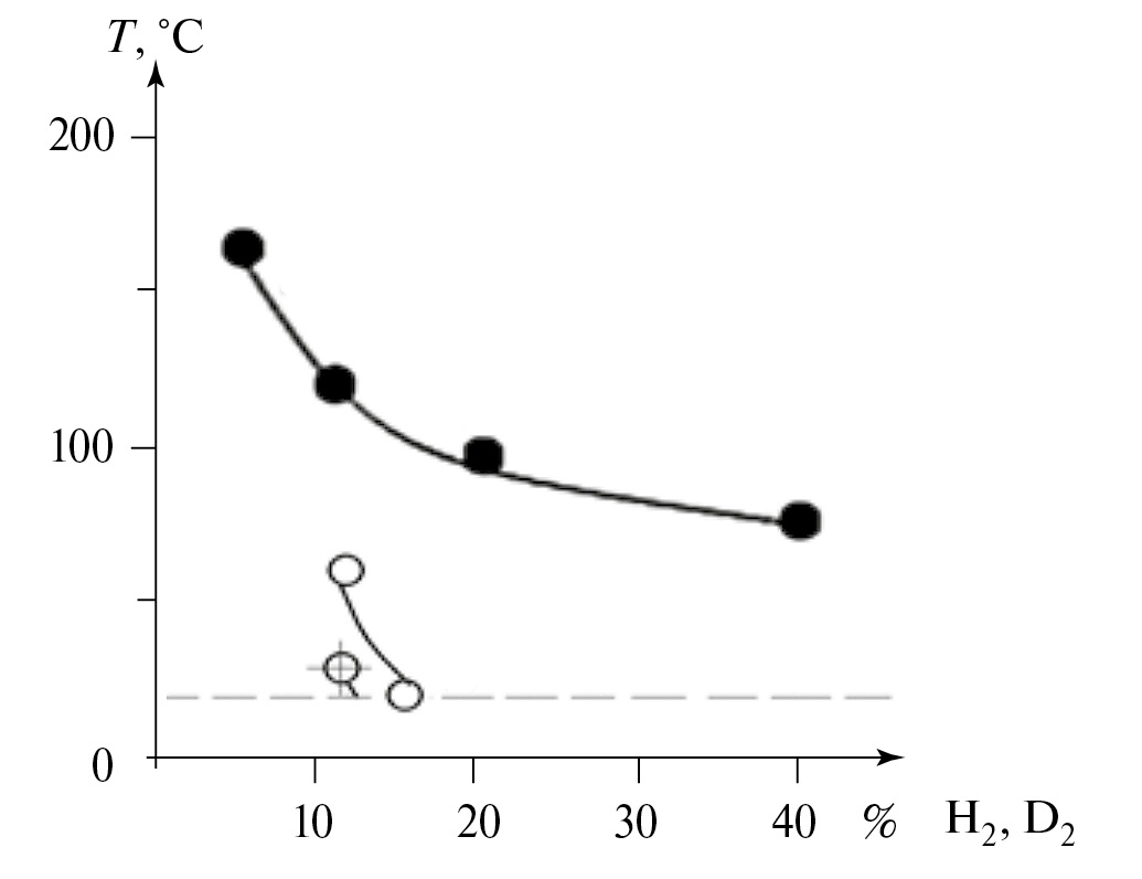 Было установлено, что каталитическое воспламенение смесей дейтерий–воздух в исследуемом диапазоне температур наблюдается при содержании дейтерия более 12%; при содержании дейтерия менее 12% наблюдается только интенсивный нагрев каталитической проволоки докрасна в течение 5 мин.