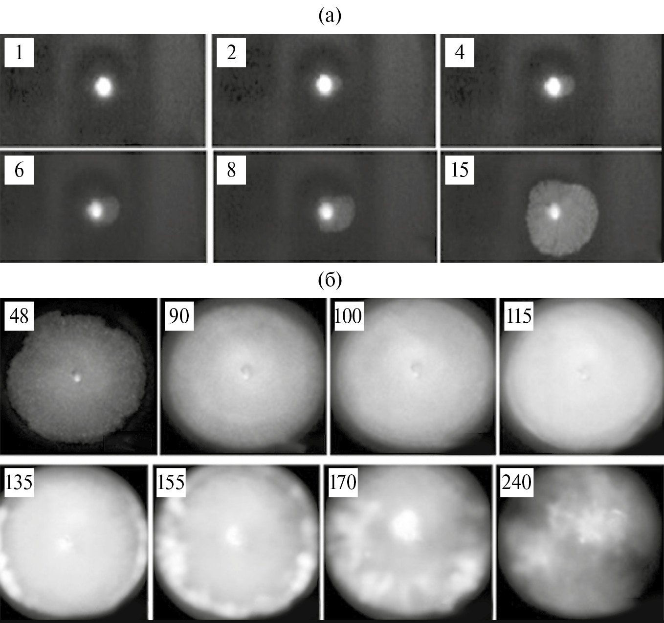 Рис. 2. а – Высокоскоростная съемка каталитического воспламенения смеси 15% D2 + воздух над Rh/Pd-проволокой (600 кадров/с, T0 = 50 °C, P0 = 1.75 атм). Первый кадр соответствует моменту возникновения первичного очага возгорания. б – Высокоскоростная съемка развивающегося каталитического воспламенения смеси 15% D2 + воздух над Rh/Pd-проволокой (1200 кадров/с, T0 = 50 °C, P0 = 1.75 атм).