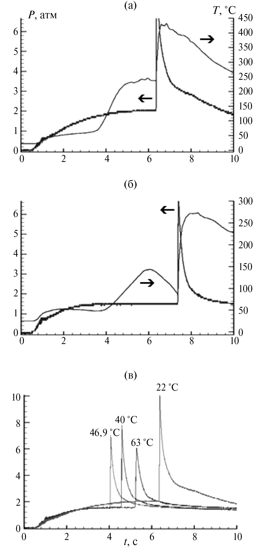 Рис. 3. Одновременная регистрация изменений давления и средней температуры Rh/Pd-проволоки во время воспламенения: a – смесь 20% D2 + воздух (T0 = 63 °C, P0 = 1.8 атм); б – смесь 17% D2 + воздух (T0 = 24 °C, P0 = 1.5 атм). в – Изменение давления во время воспламенения смеси 20% D2 + воздух при разных температурах, P = 1.8 атм.