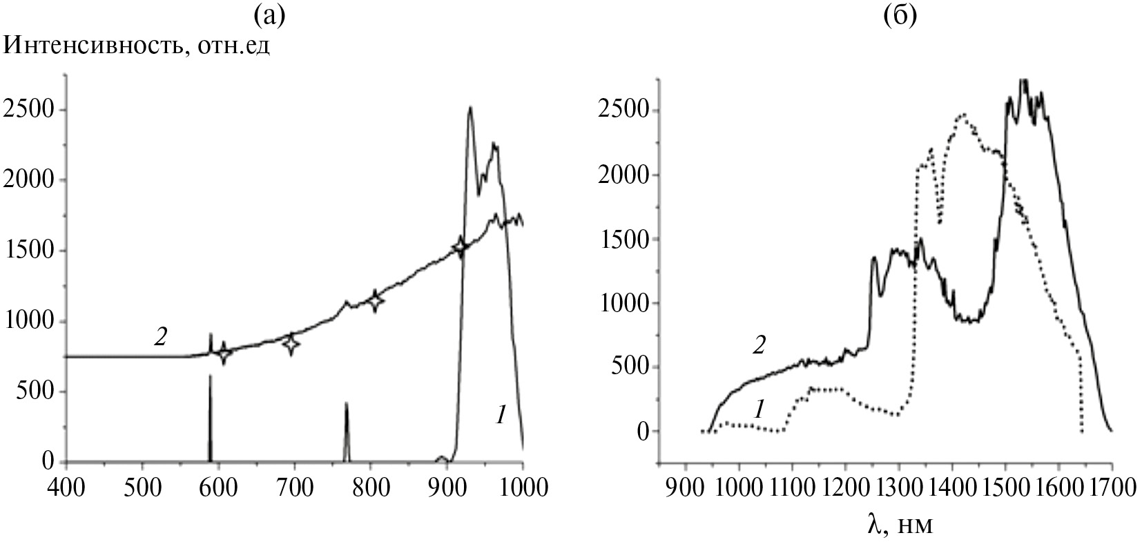 Рис. 4. Спектры излучения пламени смеси H2/D2–воздух: а – на длине волны 400–1000 нм; 1 – 40% H2 + воздух, 2 – 17% D2 + воздух, звездочки – расчеты по формуле Планка [20]; б – 900–1650 нм; 1 – 20% H2 + воздух, 2 – 17% D2 + воздух.