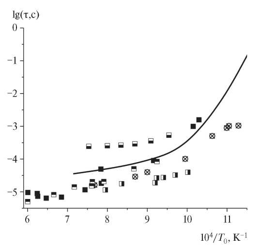 Рис. 1. Температурная зависимость задержки воспламенения (τ) стехиометрической смеси H2–воздух без добавки пропилена. Сплошная линия – расчет. Опытные данные: квадраты – данные различных авторов, приведенные в работе [17], кружки – данные из работы [18].