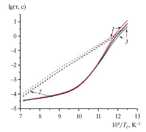 Рис. 2. Температурная зависимость задержки воспламенения смесей H2–воздух без добавки (сплошные линии) и с добавкой 1% пропилена (штриховые линии). Содержание водорода в смеси (в об.%): 15% (1), 29.6% (2), 50% (3).