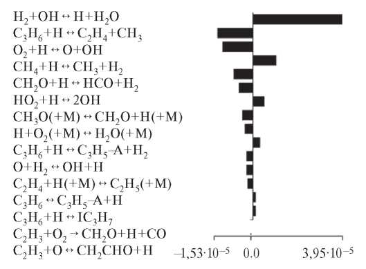 По диаграмме на рис. 3 можно сделать следующие выводы. Текущий баланс образования/убыли атомарного водорода определяют 15 химических реакций. В сумме по скорости образование атомарного водорода превалирует над его убылью с незначительным перевесом. Наибольшую скорость имеет реакция Н2 + ОН = Н + Н2О, в которой образуется конечный продукт – вода – и OH переходит в Н. Пропилен С3Н6 и его продукты превращения (С2Н4, СН2О и др.) участвуют в нескольких реакциях, приводящих к убыли атомарного водорода. Однако имеется химическая реакция с участием продукта разложения пропилена, которая генерирует атомарный водород с довольно приличной скоростью: СН3 + Н2 = СН4 + Н. Наконец, молекулы пропилена в ходе нескольких последовательных реакций образуют СО, тем самым выводя из реагирующей среды часть кислорода. Реакции разветвления цепей: О2 + Н = ОН + О, НО2 + Н = 2ОН и Н2 + О = = ОН + Н – идут в основном с заметной убылью Н и приростом ОН.
