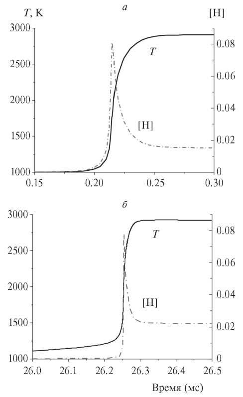 Введение добавки пропилена при начальной температуре 1000 К приводит к интересной особенности в динамике развития процесса воспламенения. На рис. 4 приведены временны́е зависимости температуры и концентрации атомов H (в мольных долях) при воспламенении стехиометрической смеси без добавки и с добавкой 1% пропилена. В обоих случаях, несмотря на значительную разницу в задержке воспламенения, участок, соответствующий длительности пика разогрева от начальной до максимальной температуры (около 50 мкс), совпадает с участком формирования лавины атомов водорода и ее ликвидацией. Также примерно одинаковы максимальные концентрации атомов Н. Однако есть существенное различие. Видно, что в варианте с добавкой пропилена перед участком пика температуры формируется пологий участок (длительностью около 2.2 мс), на котором температура растет от начальной величины почти до 1190 К при незначительном увеличении концентрации атомарного водорода. Сравнительно медленный рост температуры без накопления атомарного водорода, очевидно, вызван активным обрывом цепей в реакциях с присоединением атомов Н, которые обладают преимущественно экзотермическим эффектом. Без добавки пропилена (рис. 4а) подобный участок на графике отсутствует.