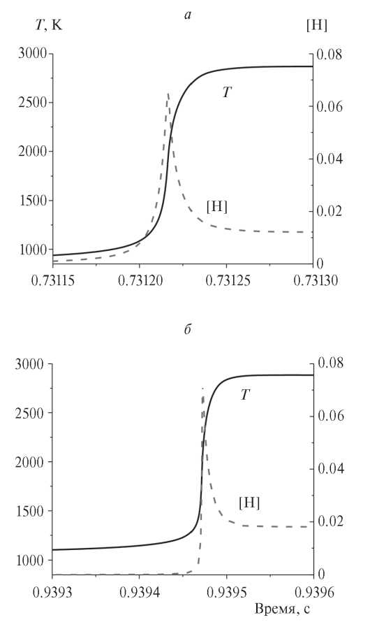 Рис. 4. Временны́е зависимости температуры и концентрации атомов водорода (в мольных долях) при самовоспламенении стехиометрической водородновоздушной смеси без добавки ингибитора (а) и с добавкой 1% пропилена (б) при начальной температуре 1000 К.