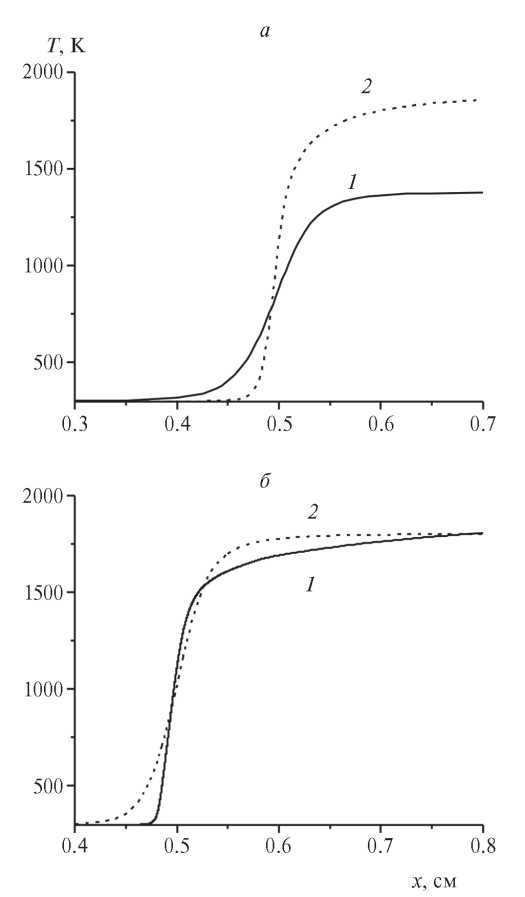 Рис. 6. Пространственные распределения температуры во фронте волны нормального горения в воздушных смесях с 15% (а) и 50% (б) водорода без добавки пропилена (1) и с добавкой 1% пропилена (2); T0 = 300 К, p = 1 атм.