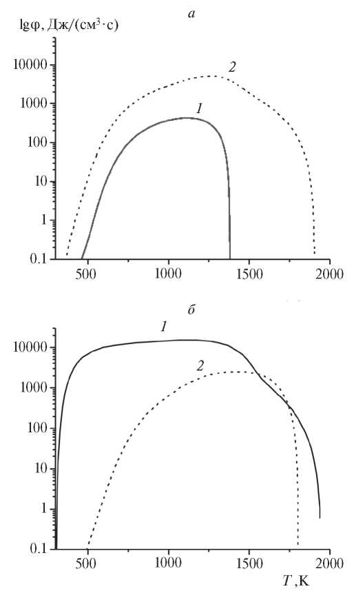 Рис. 7. Связь между логарифмом скорости выделения тепла (Φ) и температурой вдоль зоны реакции волны нормального горения воздушных смесей с 15% (а) и 50% (б) водорода без добавки (1) и с добавкой 1% пропилена (2); T0 = 300 К, p = 1 атм.