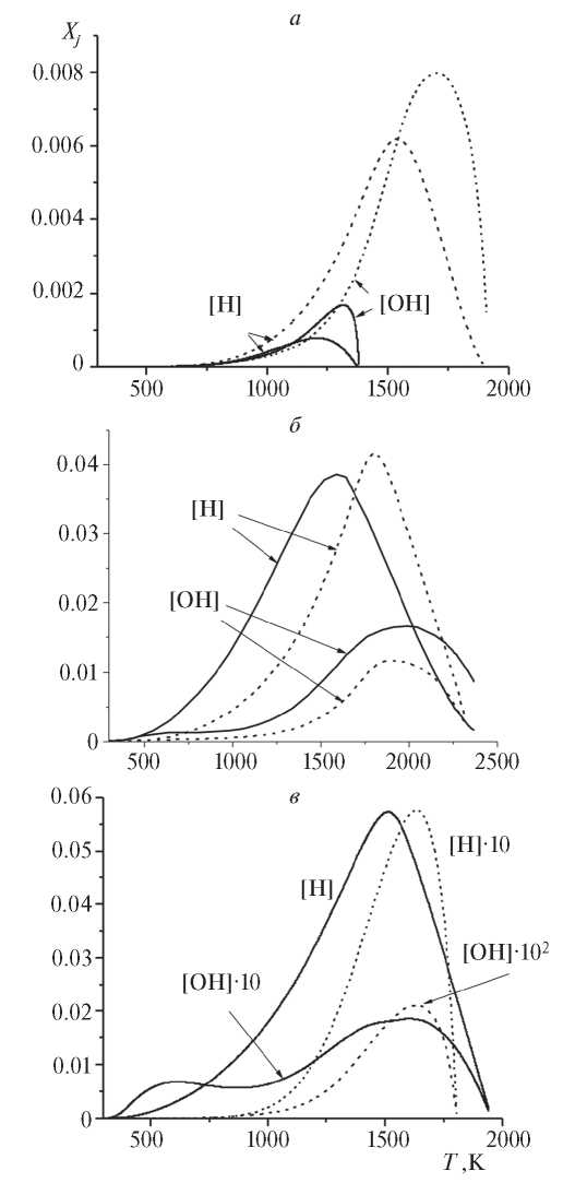 Рис. 8. Взаимосвязь между концентрацией (в мольных долях) атома водорода и гидроксила (Xj) с температурой вдоль зоны реакции волны нормального горения в воздушных смесях с 15% (а), 29.6% (б) и 50% (в) водорода без добавки (сплошные линии) и с добавкой 1% пропилена (штриховые линии); T0 = 300 К, p = 1 атм.
