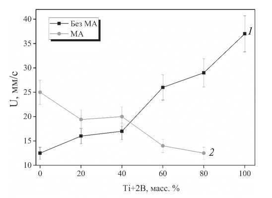 Рис. 2. Зависимость скорости горения прессованных компактов от массового содержания Ti+2B до (1) и после МА (2).