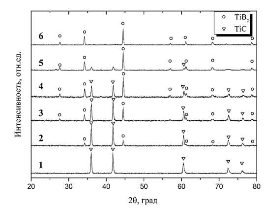Рис. 3. Типичные рентгенограммы продуктов горения: 1 – (Ti+C), 2 – 20(Ti+2B), 3 – 40(Ti+2B), 4 – 60(Ti+2B), 5 – 80(Ti+2B), 6 – (Ti+2B).
