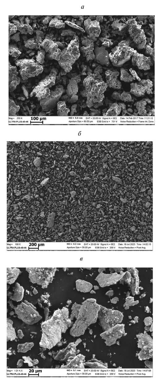 На рис. 4 представлены СЭМ-изображения исходного порошка титана и МАсмеси состава 60(Ti+2B). Исходный порошок титана имеет неправильную форму с дендритной структурой. Механоактивация порошков приводит к снижению размеров частиц титана и образованию композитных частиц, имеющих расплющенно-слоистую форму.