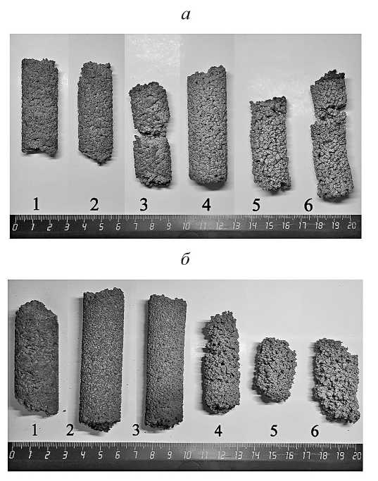Рис. 6. а – Продукты горения прессованных компактов из исходных смесей: 1 – (Ti+C), 2 – 20(Ti+2B), 3 – 40(Ti+2B), 4 – 60(Ti+2B), 5 – 80(Ti+2B), 6 –(Ti+2B); б – продукты горения прессованных компактов из МА-смесей: 1 – (Ti+C), 2 – 20(Ti+2B), 3 – 40(Ti+2B), 4 – 60(Ti+2B), 5 – 80(Ti+2B).
