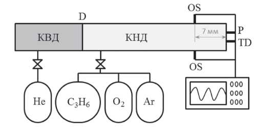 Ударные трубы являются традиционным инструментом для исследования различных высокотемпературных процессов в газах [15]. В данной работе эксперименты по измерению времени задержки воспламенения в пропилен-кислородных смесях, сильно разбавленных аргоном, проводились в ударной трубе, входящей в состав экспериментального комплекса “Ударная труба” НИИ механики МГУ [16]. Схема установки и системы регистрации параметров процесса воспламенения представлена на рис. 1. Внутренний диаметр трубы равен 57 мм, длины камер высокого и низкого давления (далее – КВД и КНД) равны 1.0 и 3.7 м соответственно. Между камерами установлена медная диафрагма D с калиброванными насечками. Варьирование толщины диафрагмы, глубины насечек и давления в камерах позволяет добиться необходимых условий за отраженной ударной волной. В качестве толкающего газа в КВД используется гелий. Установка позволяет проводить исследования при давлениях за отраженной ударной волной до 60 атм. Параметры газа за фронтом отраженной ударной волны рассчитывались с помощью программы GASEQ [17].