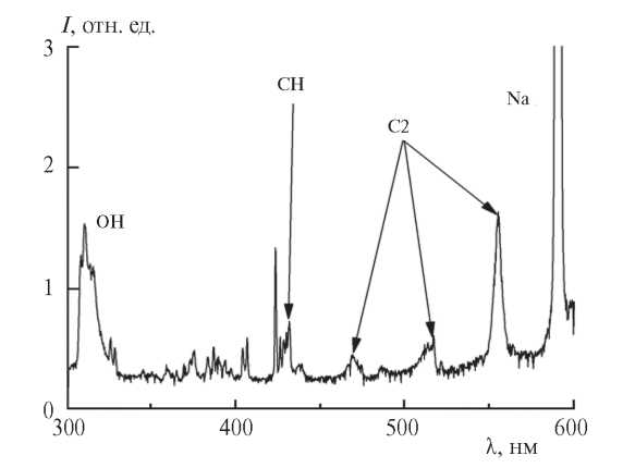 Время задержки воспламенения τign является одним из основных параметров окислительного процесса в ударно-нагретой горючей смеси. Обычно оно определяется как интервал времени между скачком давления, регистрируемым датчиком давления P при отражении ударной волны от торцевой стенки ударной трубы, и достижением максимальной скорости нарастания сигнала датчика в момент начала воспламенения смеси [18]. В смесях, сильно разбавленных аргоном, более надежный результат дает спектроскопический метод, используемый для регистрации излучения электронно-возбужденных молекул и радикалов, которые образуются на начальной стадии процесса воспламенения [19]. На рис. 2 приведен типичный пример панорамного спектра излучения смеси, зарегистрированного оптической системой OS в интервале длин волн l = 300–600 нм. Как видно из этого рисунка, на спектрограмме наблюдаются линии излучения электронновозбужденных радикалов OH• (l = 302 нм) и CH• (l = 27 нм). Излучение электронно-возбужденного молекулярного углерода C2• представлено системой полос Свана, формирующейся в переходе C2(d3Πg → a3Πu) и наблюдающейся в интервале l = 450–570 нм [20]. Максимальную интенсивность имеет полоса с длиной волны l = 553 нм. Появление атомарной линии Na можно объяснить присутствием этого элемента в кварцевом стекле, из которого сделаны окна наблюдения.