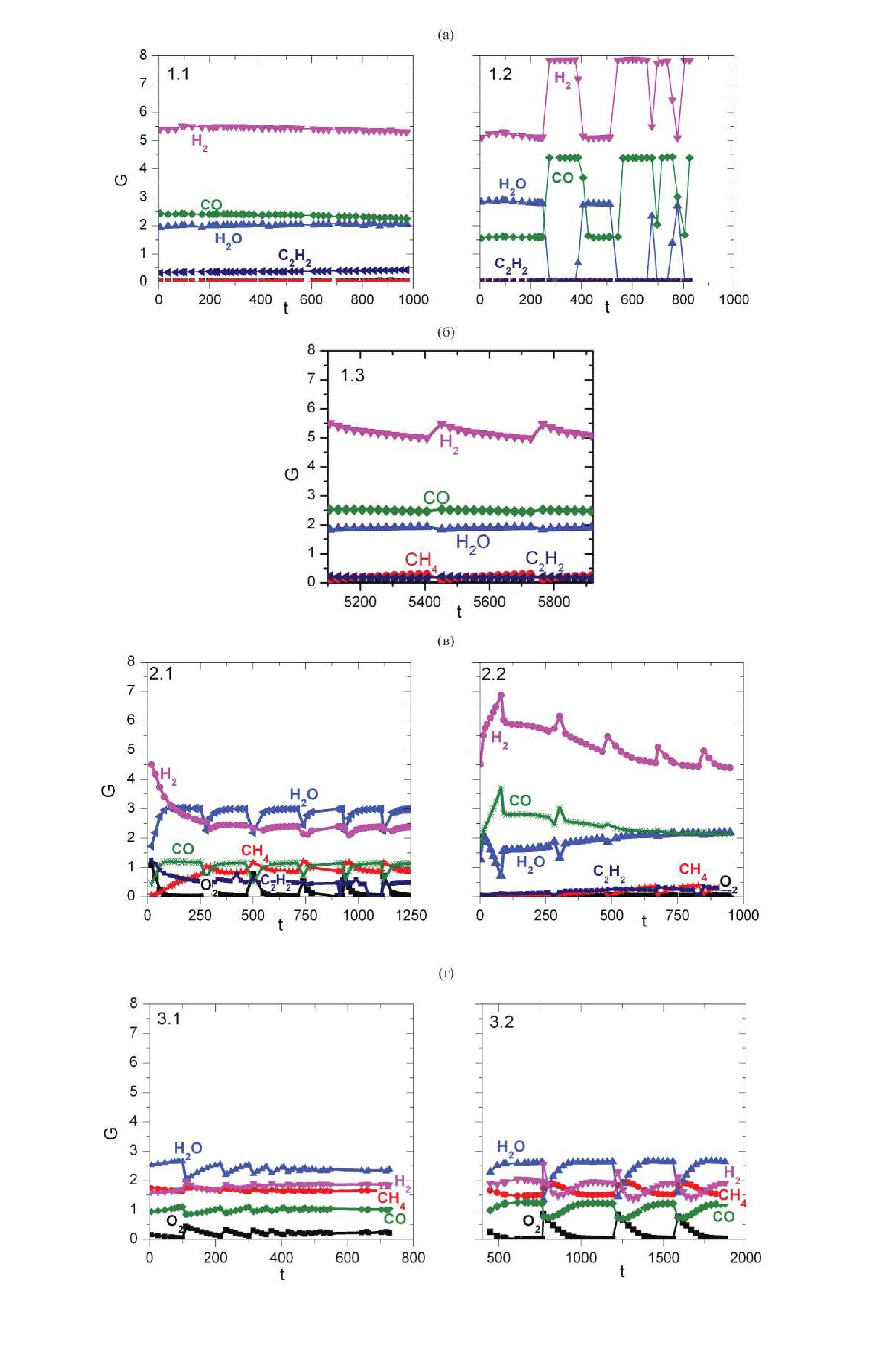 На рис. 2в изображены кривые, характеризующие потоки СН4, О2, Н2О, Н2, СО, С2Н2 на выходе из реактора для другого начального теплового импульса и двух описанных выше реакций образования прекурсора сажи С4Н4 (варианты 2.1 и 2.2). Для варианта 2.2 доля водорода на выходе из реактора выше, чем для варианта 2.1. Но при этом видно, что в отличие от последнего, в варианте 2.2 в течение времени расчета не удалось достигнуть относительно установившегося цикла, воспроизводящего в последующих циклах обращения потока выход продукта, а длительность самих циклов была бы приблизительно постоянной.