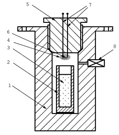 Рис. 1. Схема манометрической бомбы: 1 – стенки бомбы, 2 – металлический стаканчик, 3 – исследуемый состав, 4 – воспламенитель, 5 – крышка бомбы, 6 – нихромовая спираль, 7 – электрические вводы, 8 – датчик давления.